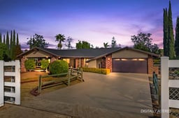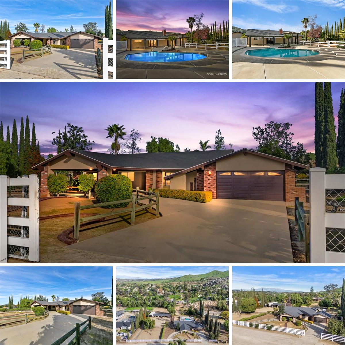 Beautifully maintained ranch-style home featuring a charming covered front carriage porch, privately gated and situated on 1.50 acres with a circular driveway. The property is fully fenced with convenient pull-through double gates providing full access to the backyard. Step inside to a tiled entry and formal living room accented with plantation shutters. The inviting family room showcases stunning wood-beamed ceilings and a dramatic full rock wood-burning fireplace creating warmth and character throughout. Real wood doors and wood casings highlight the home’s quality craftsmanship. The kitchen is open to the family room and offers a breakfast bar, granite countertops, newer stainless steel appliances, double ovens, microwave, and large windows overlooking the backyard. The home features 3 spacious bedrooms and 2 bathrooms, including a hall bath with tub/shower combo. The primary suite includes a private bathroom with dual sinks, vanity, and direct access to the back patio. The exterior has been freshly painted and the backyard is perfect for entertaining with a covered patio featuring an Alumawood cover and a sparkling swimming pool. Equestrian amenities include a 4-stall block barn with tack room and hay storage, along with a large RV cover. Plenty of room for an arena, shop, or ADU. This exceptional property truly reflects pride of ownership.