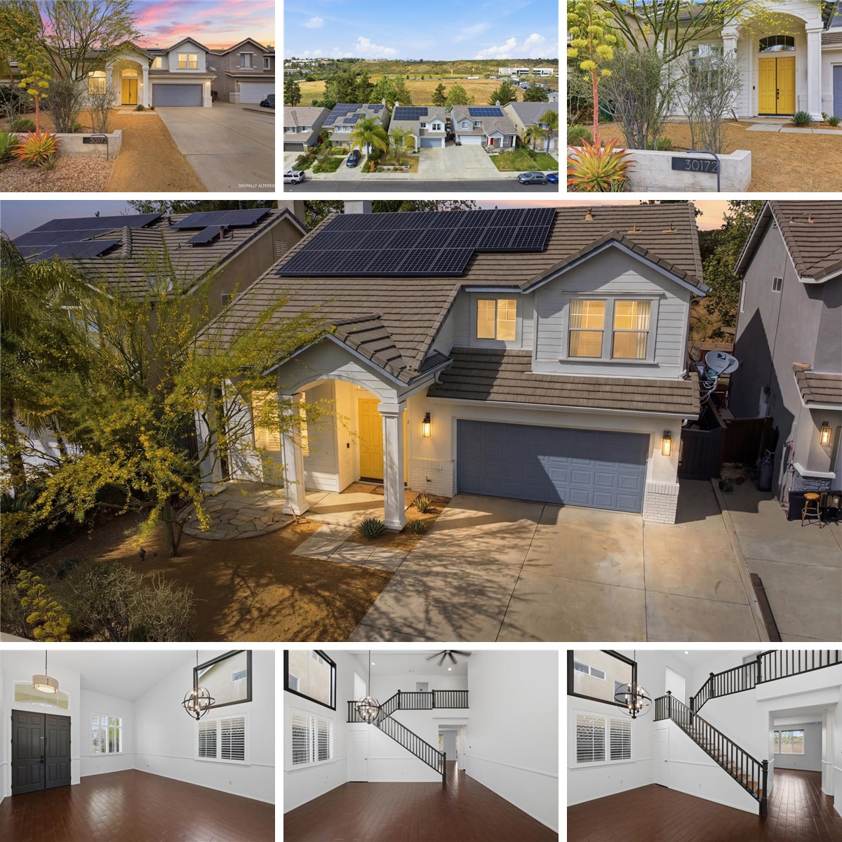 This stunning 4-bedroom, 2.5-bath home offers approximately 2,470 square feet and sits on a quiet cul-de-sac with beautiful curb appeal. Step into this impeccably clean and upgraded home through a welcoming entry. Inside, high ceilings create an open feel, complemented by gorgeous wood and tile flooring throughout (no carpet), plantation shutters, ceiling fans, and a cozy fireplace in the family room. The kitchen features a central island, built-in shelving, a 6-burner GE Cafe stainless steel stove with double ovens, a KitchenAid dishwasher, and a large walk-in pantry, offering plenty of space for everyday living and entertaining. Additional upgrades include tankless water heater, whole house water softener, newer HVAC system, a thermostatically controlled attic ventilation fan and high-end Toto heated toilets throughout. The primary suite offers a spacious setting with doors leading to a large Trex deck with great views. The primary bathroom has been completely remodeled and showcases premium finishes, including Hansgrohe and Restoration Hardware fixtures, Walker Zanger tile, and Hinkley lighting, marbel countertops along with custom cabinetry featuring pull-out shelving and soft-close drawers. This spacious bathroom also includes a large walk-in closet with an Elfa organization system.. Most of the interior has just been repainted, offering a fresh & clean canvas for new owners. The exterior is enhanced by a welcoming double door entry and a low-maintenance front and backyard with extensive hardscape. The backyard features artificial turf, garden wall planters, and a storage shed that will remain, creating a private setting with space to relax or entertain. The garage includes built-in storage racks for added organization, and the extra-wide driveway provides additional parking flexibility. A standout feature of the home is the 22-panel owned solar system with backup battery—providing energy efficiency without the added cost of a lease. The community has no HOA, a very low tax rate, and is centrally located near everything in Murrieta. Welcome home!