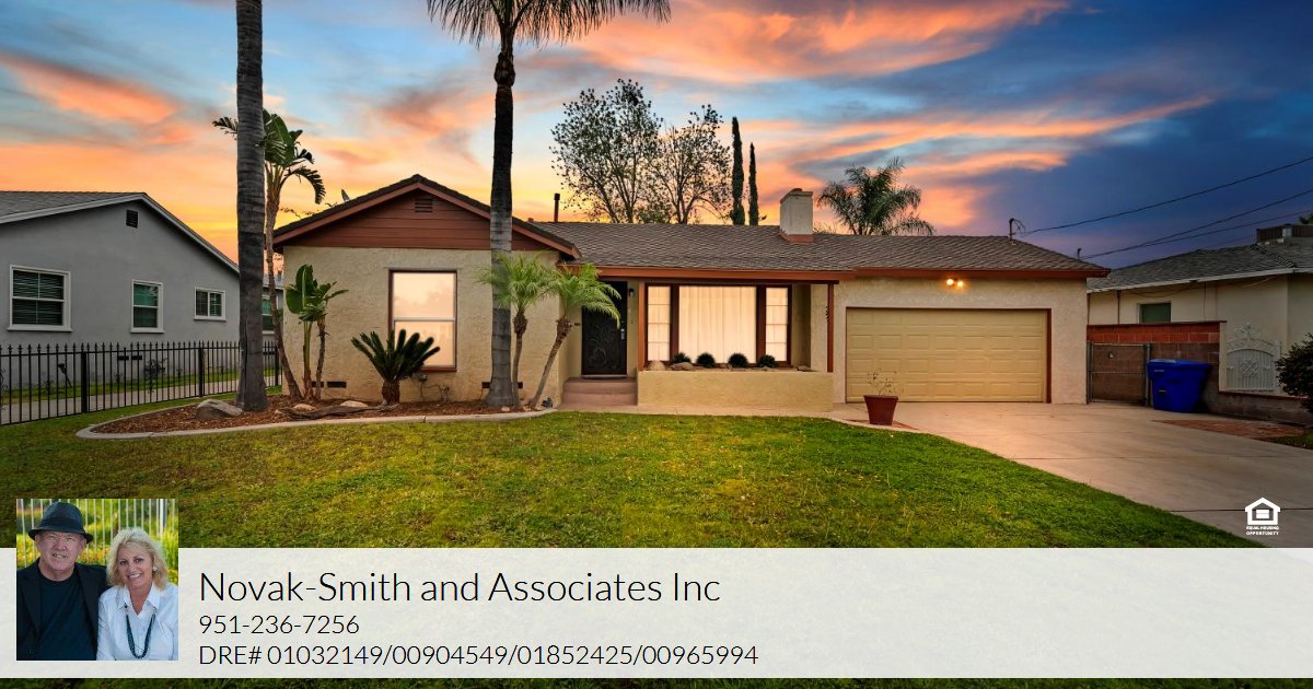 This beautiful home is move in ready with new exterior and interior paint; upgraded kitchen & bath; new carpeting in living room, dining area and two bedrooms. The sparkling bathroom has a separate tub and a separate shower and a vanity. The bright remodeled kitchen has new white counters and cupboards with self-closing drawers. Automatic sprinklers front and back. Great curb appeal. The garage is a 2-car attached garage with rollup door. The garage might be a good option and consideration for a conversion to an ADU (Accessory Dwelling Unit). This is a fantastic opportunity for a first-time buyer to own a well-maintained 1950's home with two bedrooms; and a spacious yard. This home offers close freeway access and is close to schools, shopping, medical facilities and minutes away from two major golf courses. Metrolink commuter rail is within 7 miles. Don't miss out on this property. NOT FOR RENT OR LEASE.