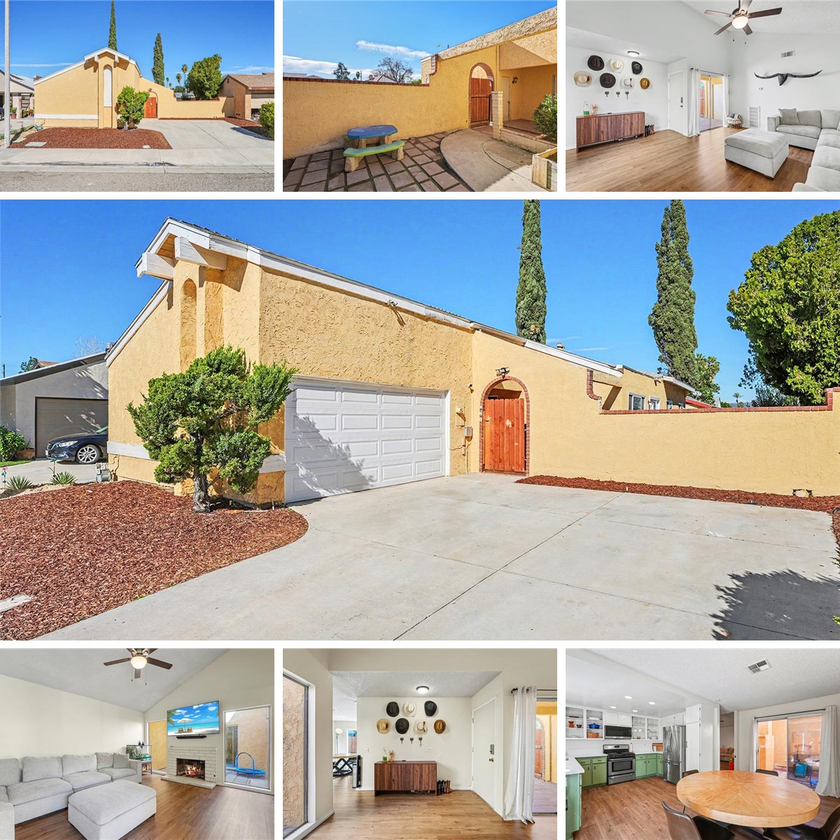 Welcome to this charming Spanish Hacienda-style single-story home, offering 3 bedrooms and 2 bathrooms across over 1,500 sq.ft.! The authentic Spanish Hacienda vibe begins with a welcoming courtyard entry and continues with a second, central courtyard inside the home, adding unique character. Inside, you'll find a spacious and comfortable living room featuring a cozy fireplace. The kitchen is generously sized, offering ample quartz countertop space, open shelving cabinets and flows seamlessly into the dining room. This home shines with recent updates, including newer luxury vinyl plank flooring throughout the main areas, complemented by warm carpet in the bedrooms. The hall bathroom was recently updated, along with the sliding glass door in the dining room and some windows. Key structural updates offer peace of mind, with the roof replaced approximately 3 years ago, and the AC, heating units, and hot water heater all replaced less than a year ago. A portion of the wood fence has also just been replaced. The property is complete with a spacious side and backyard, a 2-car attached garage with a spacious driveway.