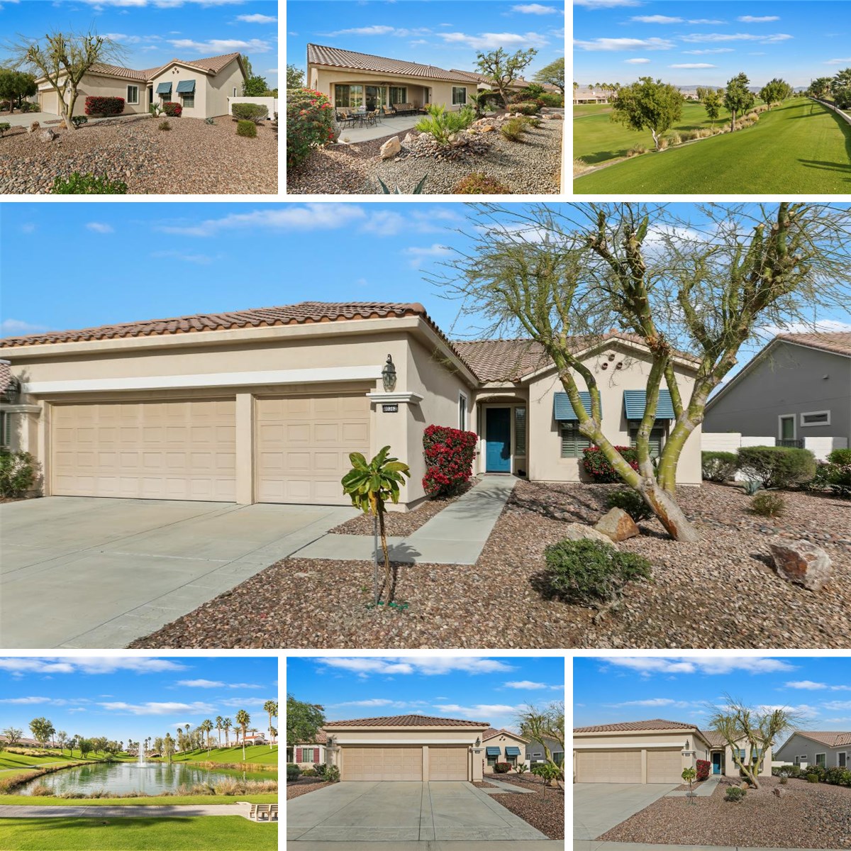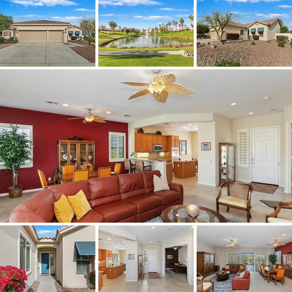 Perfectly positioned along the 12th tee of the South Course in Sun City Shadow Hills Phase I, this beautifully enhanced San Benito model captures sweeping views of the golf course, tranquil water features, and the Chocolate Mountains beyond. The setting, orientation, and layout come together to create an exceptional desert living experience. Inside, the home offers a flexible and well-planned design featuring 2 bedrooms, 2 bathrooms, a den/office, and an additional bonus room, allowing space for guests, hobbies, work-from-home needs, or a private retreat. The Great Room is filled with natural light and expansive windows that frame the outdoor scenery, seamlessly connecting to the open kitchen and dining areas. The kitchen is thoughtfully appointed with slab granite countertops, double ovens, a center island, breakfast bar seating, modern and a cheerful breakfast nook, making it ideal for both everyday living and entertaining. The primary suite provides a comfortable escape with direct backyard access, dual vanities, a soaking tub, separate shower, and an oversized walk-in closet. Guest accommodations and bonus spaces are equally versatile and inviting. Step outside to a north-facing backyard designed for year-round enjoyment, offering cooler afternoon shade, natural wind protection, and peaceful pond and fairway views. Low-maintenance landscaping in both the front and rear yards enhances the home's ease of ownership and lock-and-leave appeal. Additional features include plantation shutters throughout and an oversized 2-car garage with dedicated golf cart space. With its ideal lot orientation and scenic backdrop, this home delivers comfort, quality, and resort-style living in one of the Coachella Valley's most sought-after 55+ communities.